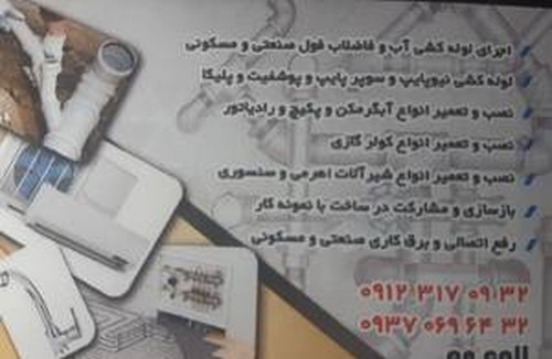 اجرای لوله کشی آب و فاضلاب فول صنعتی و مسکونی، لوله کشی نیوپایپ و سوپر پایپ و پوشفیت و پلیکا، نصب و تعمیر انواع آبگرمکن و پیکیج رادیاتور، نصب و تعمیر انواع کولرگازی، نصب و تعمیر انواع شیرآلات اهرمی و سنسوری، بازسازی و مشارکت در ساخت، رفع اتصالی و برقکاری صنعتی و مسکونی